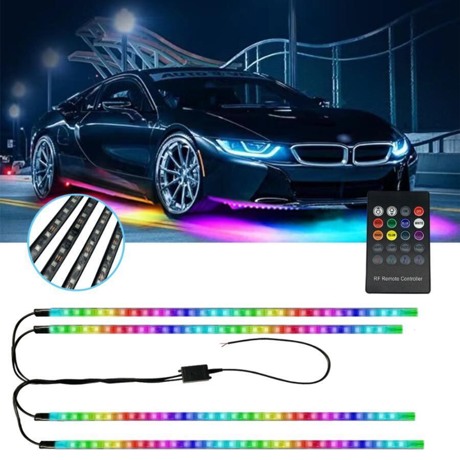 車用 車 RGB LEDテープ アンダーライト Mサイズ 4本セット サウンドセンサー LEDライト フルカラー 防水 IP65 フラッシュ リモコン / スマホ カー用品 (車用アンダー)