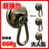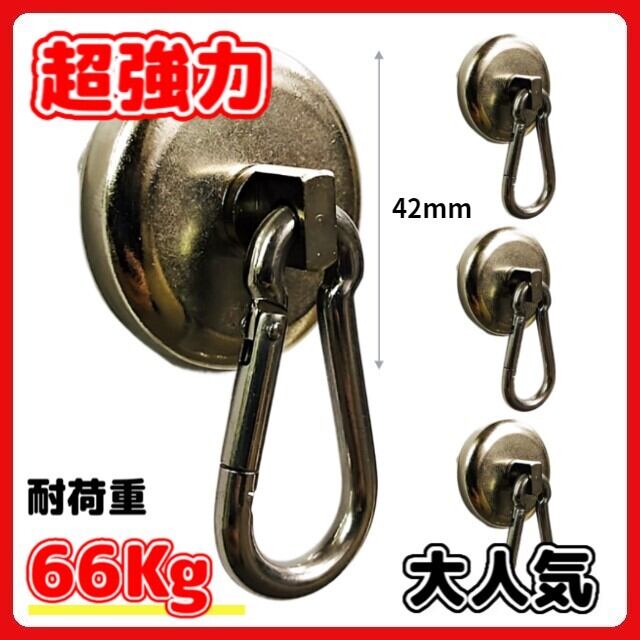 超強力 マグネットフック カラビナ 42mm 4個セット ネオジム磁石 強力 磁石 耐荷重66Kg ステンレス マグネット 防錆 防水