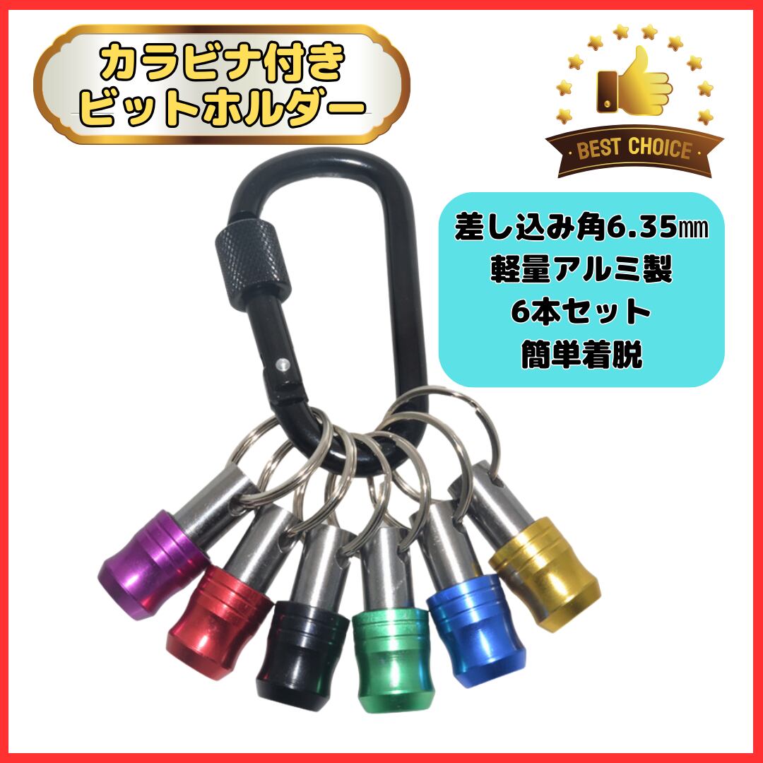 6色 ビットホルダーセット 軽量 16g アルミ製 カラビナ付き 腰袋装着可 引き上げ式 6.35mm 対応 ドライバーソケット 六角軸 ビットケース ソケットホルダー キーホルダー型 収納 (BHS01)